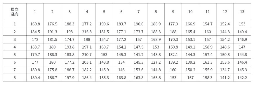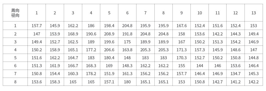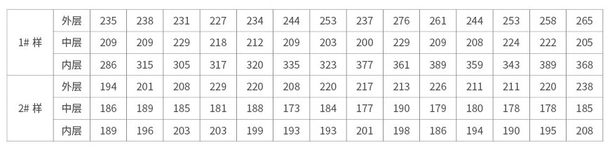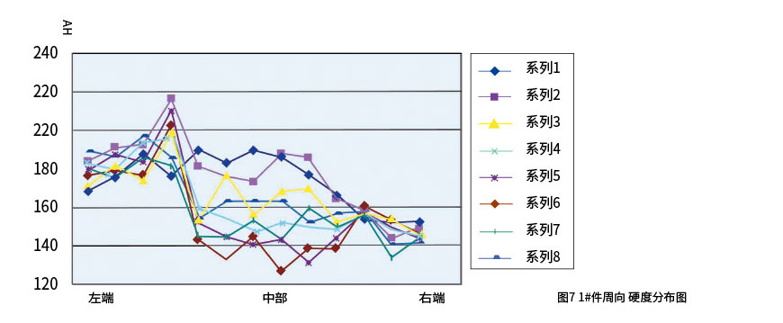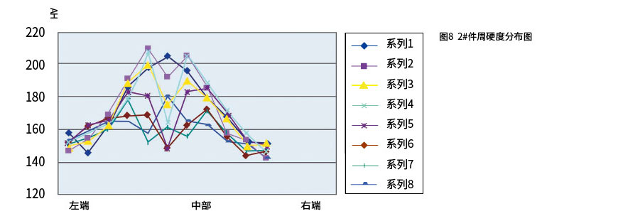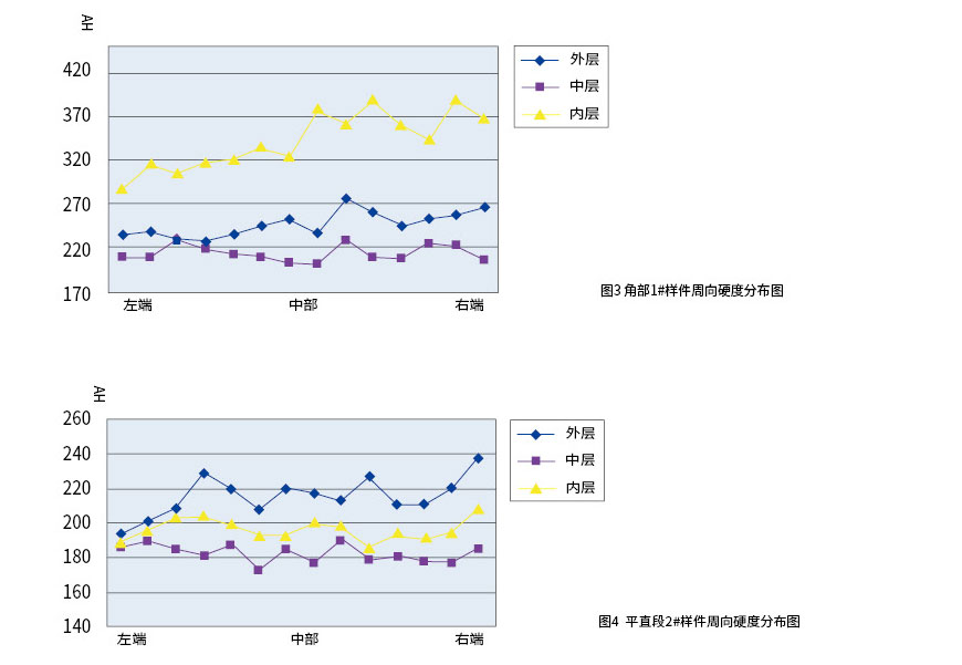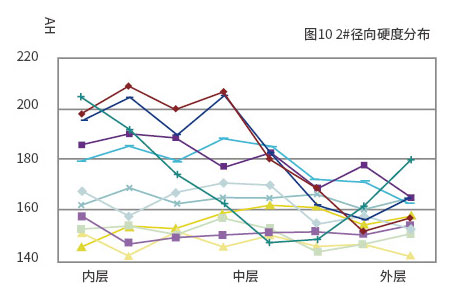 從圖中曲線可看出,在每一條曲線上都有內、中、外層的點,曲線的起伏也就可見三層硬度大小的不同。該曲線圖反映的規律同周向硬度分布情況一樣:一般為內層硬度最高,外層次之,中心層最小。