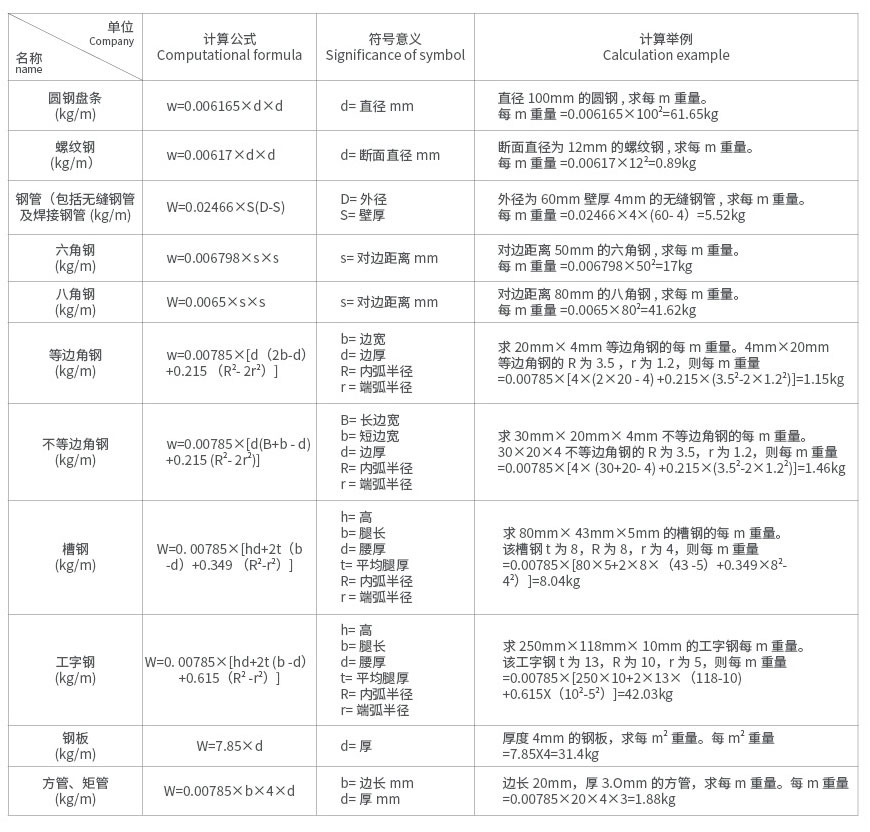 各種鋼材的理論重量計(jì)算公式及示例